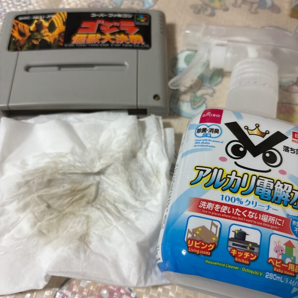 レトロゲームカセットのクリーニングでは、いきなり強い洗剤を使うより、まず「アルカリ電解水」で表面を拭く“予備洗い”*から始めるのがおすすめです。
