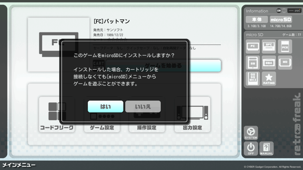 レトロフリークの一番の魅力は、カートリッジ(ソフト)を挿すだけでデータをインストールできることだと思います。