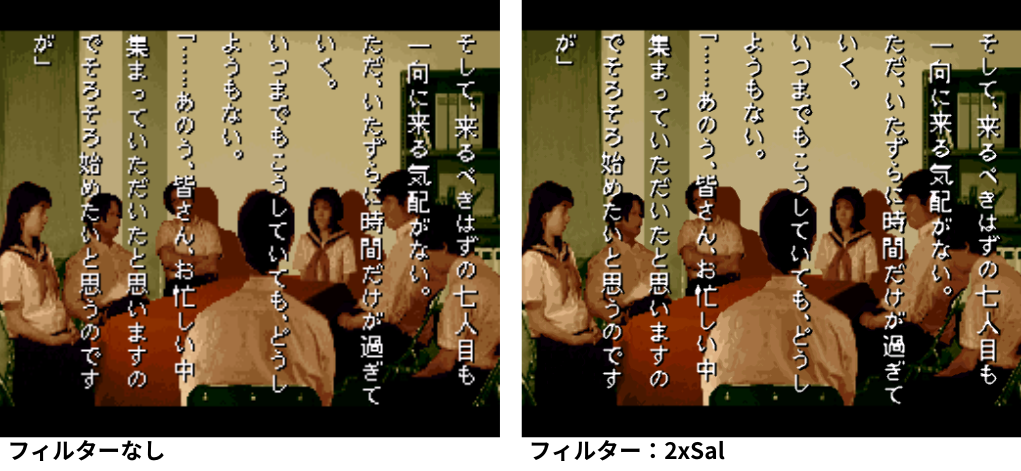 たとえば映像だと、ドットをなめらかに見せるフィルターだったり、テレビに合わせて画面を全画面表示にしたり。