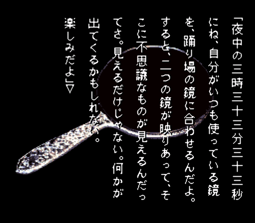 夜中の三時三十三分三十三秒に、いつも自分が使っている鏡を、踊り場の鏡に合わせると言いながら、薄汚れた女物の手鏡を持ってきた吉岡。