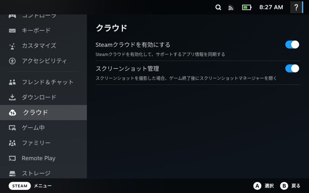 - Steam Deckの設定でSteamクラウドを有効にする
