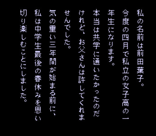 主人公・前田葉子は、中学最後の春休み、祖母の七回忌のために家族とともに田舎の本家へ帰省する。