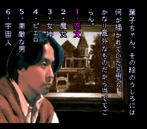 「絵の後ろには何が書かれていたと思う?」と聞かれ、選択肢は恋文、魔女、女神、ピエロ、素敵な男、宇宙人の6つ。