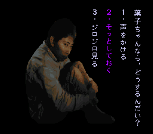 2(しばらく様子を見る) → 1(早く話を始めてほしい) → 3(幽霊) → 2(ない) → 1(実はある) → 3(火を起こす) → 2(いや行きたくない) → 1(声をかける) → 2(我慢できない) → 1(ステキね)