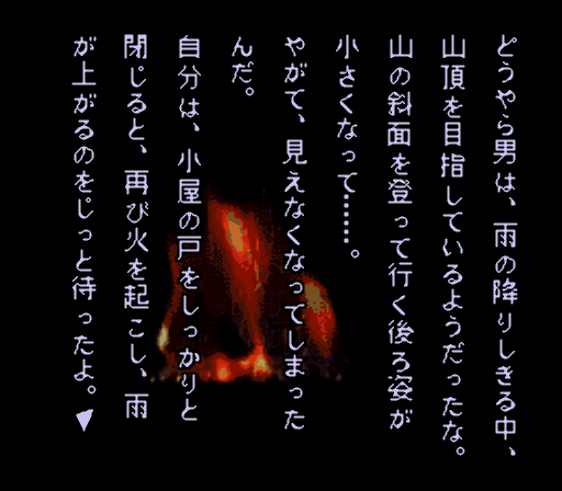 天候の急変で山小屋に避難した哲夫は、焚き火の前でうずくまる男の姿を見つける。